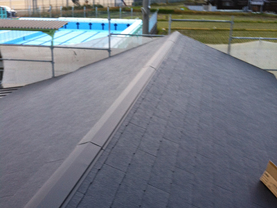 金属屋根に比べて落ち着いたデザインで、平たいのでスッキリと見えるということで主に新築で使われることが多い屋根材です。
